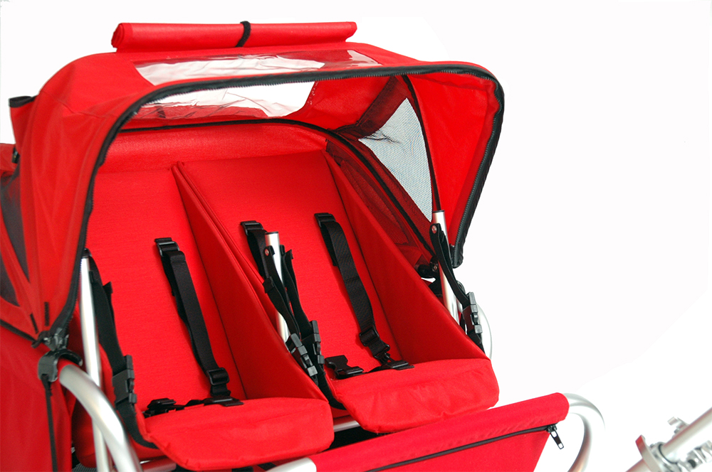 Je nach Wetter kann die Abdeckung in verschiedenen Positionen angebracht werden, vorne oder hinten. Ein Fenster ist mit einem verschließbaren Belüftungsdrahtnetz ausgestattet.